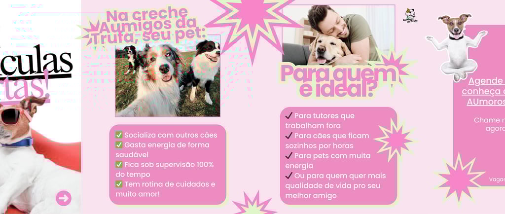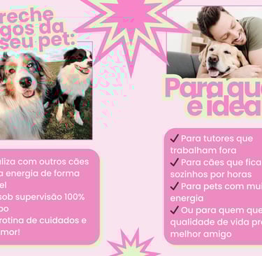 Bastidores da Creche: Mostre a rotina. O tutor que está trancado no escritório o dia todo sente uma culpa enorme por deixar o cachorro em casa. Quando ele vê vídeos dos cães gastando energia, socializando e brincando com segurança, você ativa o gatilho do desejo.